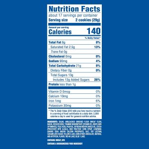Allergens CONTAINS: WHEAT, SOY. Serving Size 2 cookies (29g) Servings Per Container About 17 Calories Per Saving 140 Total Fat Grams 6g Total Fat % Daily Value 8% Saturated Fat Grams 2.5g Saturated Fat % Daily Value 13% Trans Fat Grams 0g Choleterol Milligrams 0mg Cholesterol % Daily Value 0% Sodium Milligrams 90mg Sodium % Daily Value 4% Total Carbs Gram 21g Carbohydrate % Daily Value 8% Dietary Fiber Grams 0g Dietary Fiber % Daily Value 0% Sugar Grams 13g Added Sugar Grams 13g Added Sugar % Daily Value 26% Protein Grams less than 1g Calcium 10mg/0% Iron 1mg/6% Vitamin A 0