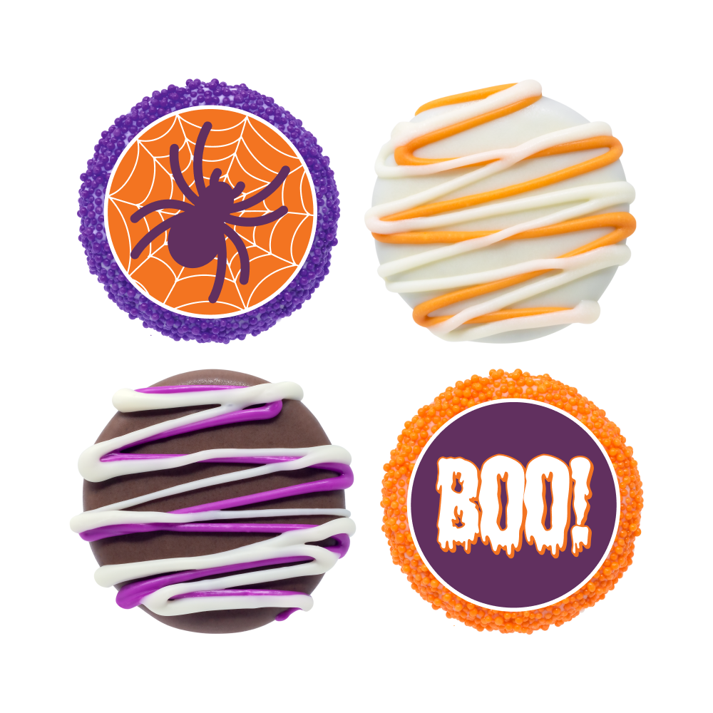 Celebrate Halloween with our OREOiD Halloween cookies! Show your spooky side with purple and orange sprinkles, drizzles, and Halloween-themed designs. Complete with a creepy-but-cute spider on the belly band, this 12 count box makes a great gift or addition to any Halloween party.